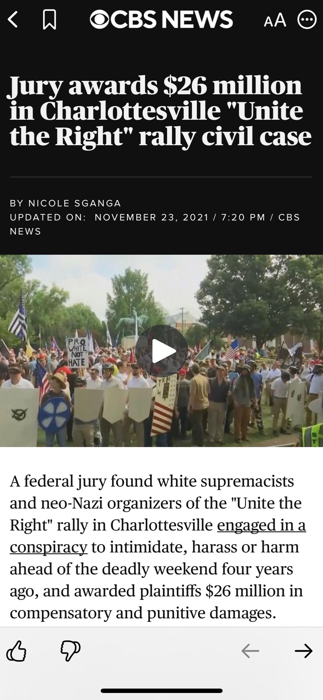 Jury awards $26 million in Charlottesville “Unite the Right” rally civil case Posted byJ ReedNovember 23, 2021January 7, 2022Posted inCriminal Justice Reform, Editorial, Entertainment, News and True Crime, Non-fiction, political, politics, poltics, Racsim, True StoryTags:black lives matter, black love matters, Charlottesville, Christopher Cantwell, Inspirational, Inspire, James Alex Field, Jason Kessler, lawsuit, poltical, racism, Richard Spencer, self-help, Unite the Right Jury awards $26 million in Charlottesville “Unite the Right” rally civil case Discover more from The Reeders Block Subscribe to get the latest posts sent to your email. Type your email… Subscribe Share this: Click to share on X (Opens in new window) X Click to share on Facebook (Opens in new window) Facebook Click to share on LinkedIn (Opens in new window) LinkedIn Click to share on Reddit (Opens in new window) Reddit Click to share on Tumblr (Opens in new window) Tumblr Click to share on Pinterest (Opens in new window) Pinterest Click to share on WhatsApp (Opens in new window) WhatsApp Like Loading... Related Published by J Reed J Reed is a Chicago-based fiction writer. When he isn't writing, he's making a pretense of writing. View more posts