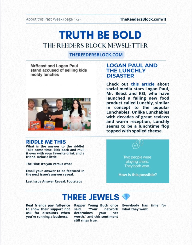 Truth Be Bold: The Newsletter Posted byThe Reeders BlockNovember 17, 2024July 16, 2025Posted inEntertainment, truth be bold newsletterTags:great newsletters, newsletter, the reeders block Check out the Truth Be Bold Reeders Block Newsletter and Catch Up Discover more from The Reeders Block Subscribe to get the latest posts sent to your email. Type your email… Subscribe Share this: Click to share on X (Opens in new window) X Click to share on Facebook (Opens in new window) Facebook Click to share on LinkedIn (Opens in new window) LinkedIn Click to share on Reddit (Opens in new window) Reddit Click to share on Tumblr (Opens in new window) Tumblr Click to share on Pinterest (Opens in new window) Pinterest Click to share on WhatsApp (Opens in new window) WhatsApp Like Loading... Related Published by The Reeders Block TheReedersBlock.com brings you the latest entertainment, political and hip hop news with a dose of bold truth. Don’t forget to download your copy of this site’s Truth Be Bold newsletter. View more posts