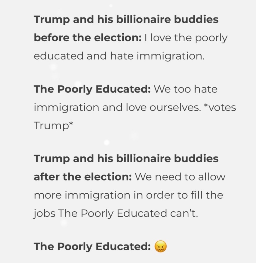 Poor whites have been told lucrative jobs are going to unqualified Black employees through Diversity, Equity and Inclusion policies. These people have no clue what DEI is or what it does. They don’t realize DEI ensures that the Black person with experience, education and no criminal history isn’t overlooked for an unqualified candidate with 34 or 35 felony convictions. Without it, that could happen. Check the results of the most recent presidential election.