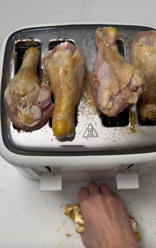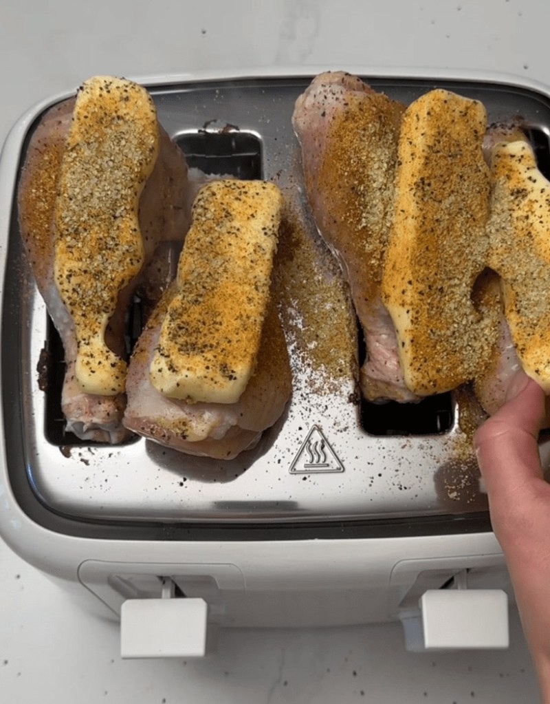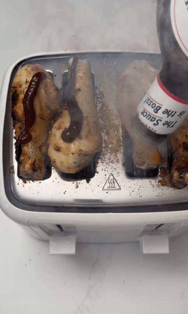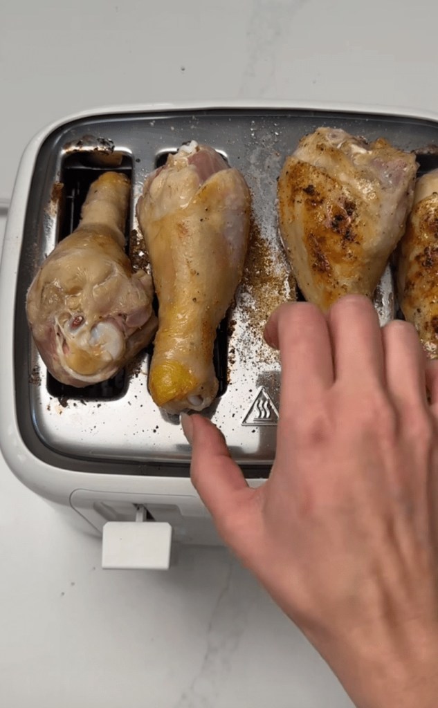 In this video shared to Facebook Reels by Janelle & Kate, an anonymous person cooks chicken drumsticks on a toaster. It should be noted that in this review that the word “cook” is being used very loosely here. Also, this isn’t similar to air fryer salmon or stir frying, as some have said.
