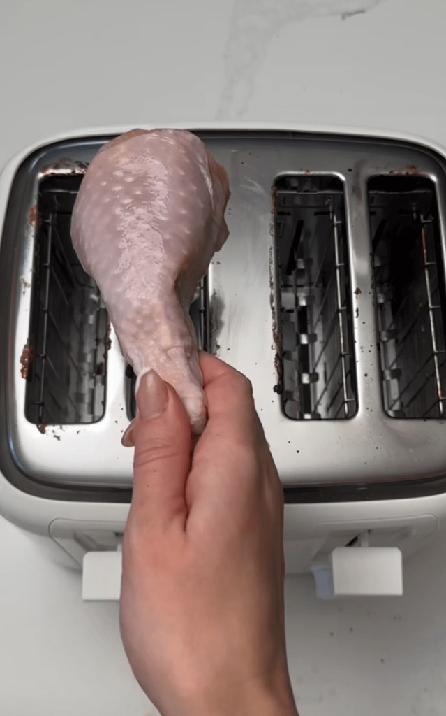 Some people are fascinated with bad food, and that’s what this video might be. It’s probably why some people can’t stand TikTok food. This video starts with a barehand placing raw chicken drumsticks on a toaster. It is at this very moment, not one second in, do you realize something isn’t right in the kitchen. With freshly painted fingernails, the cook, if you will, presses down the lever on the toaster to begin cooking.