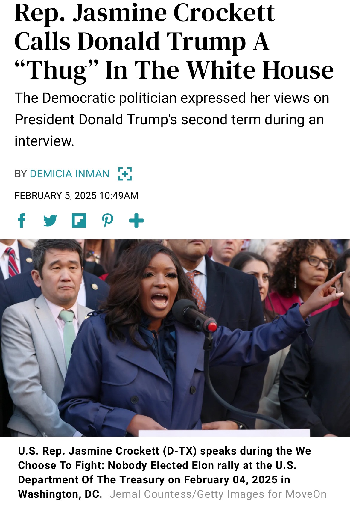 One thought on “Rep. Jasmine Crockett Calls Trump “A Thug in Charge of the United States” — And It’s True