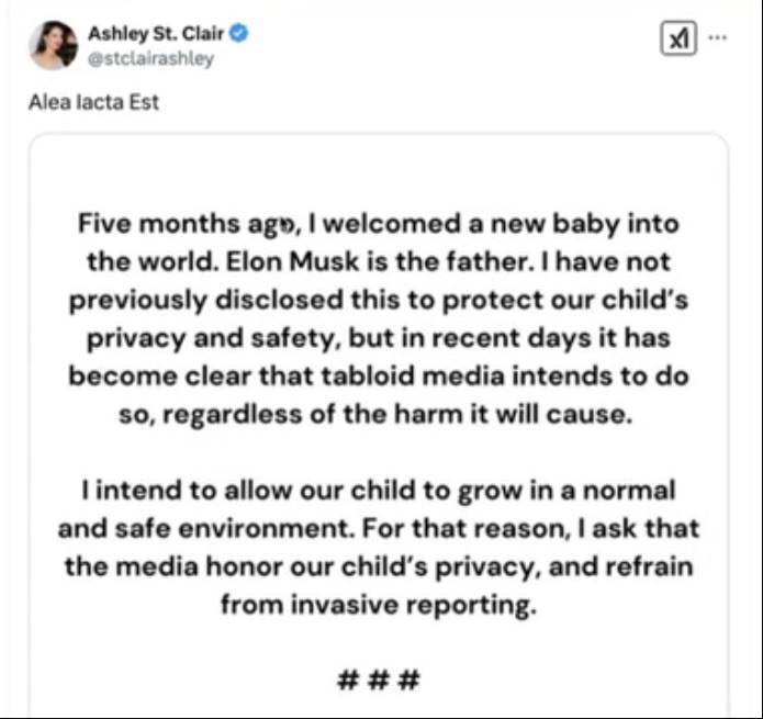On X, St. Clair wrote, “Five months ago, I welcomed a new baby into the world. Elon Musk is the father. I have not previously disclosed this to protect our child’s privacy and safety, but in recent days it has become clear that tabloid media intends to do so, regardless of the harm it will cause.