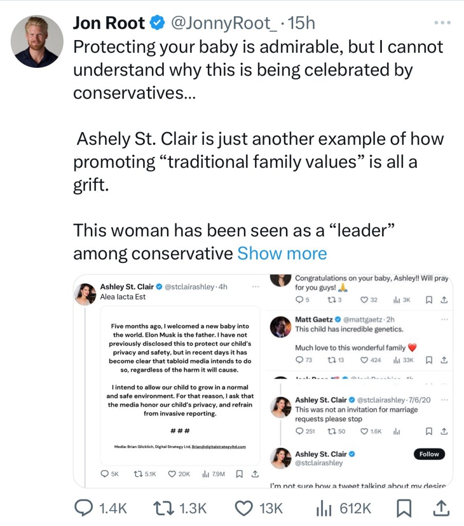 Much of the angst doesn’t seem to be the fact that St. Clair is pregnant out of wedlock, as the consensus is, she shouldn’t be shamed for it. The primary argument is, when conservatives do it, it’s fine but not when anyone else does it. It is unclear what Elon Musk’s next move will be. St. Claire does have supporters standing by her side wishing her well and offering their support.