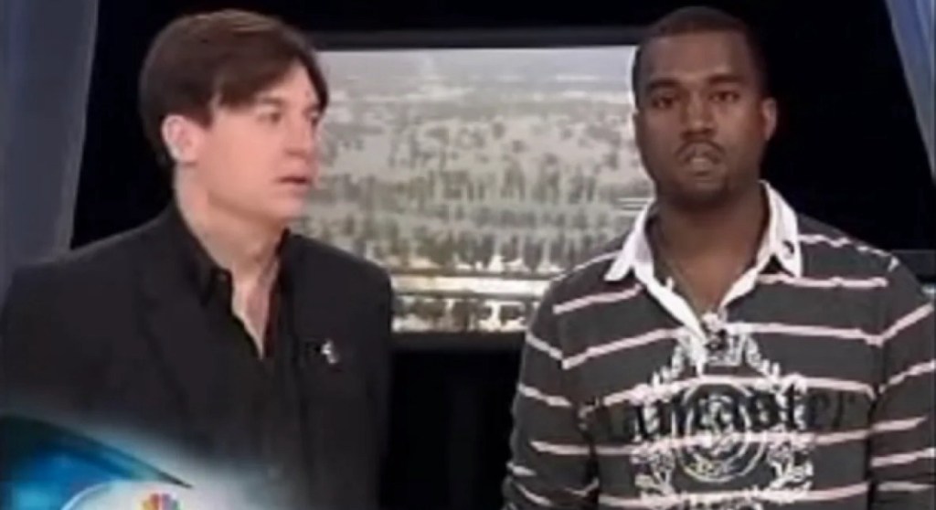 The moment in 2005 when Kanye said on live tv, “George Bush don’t care about Black people,” as evidenced by the sheer horror on Mike Myers’s face. Photo from Yahoo.com.
