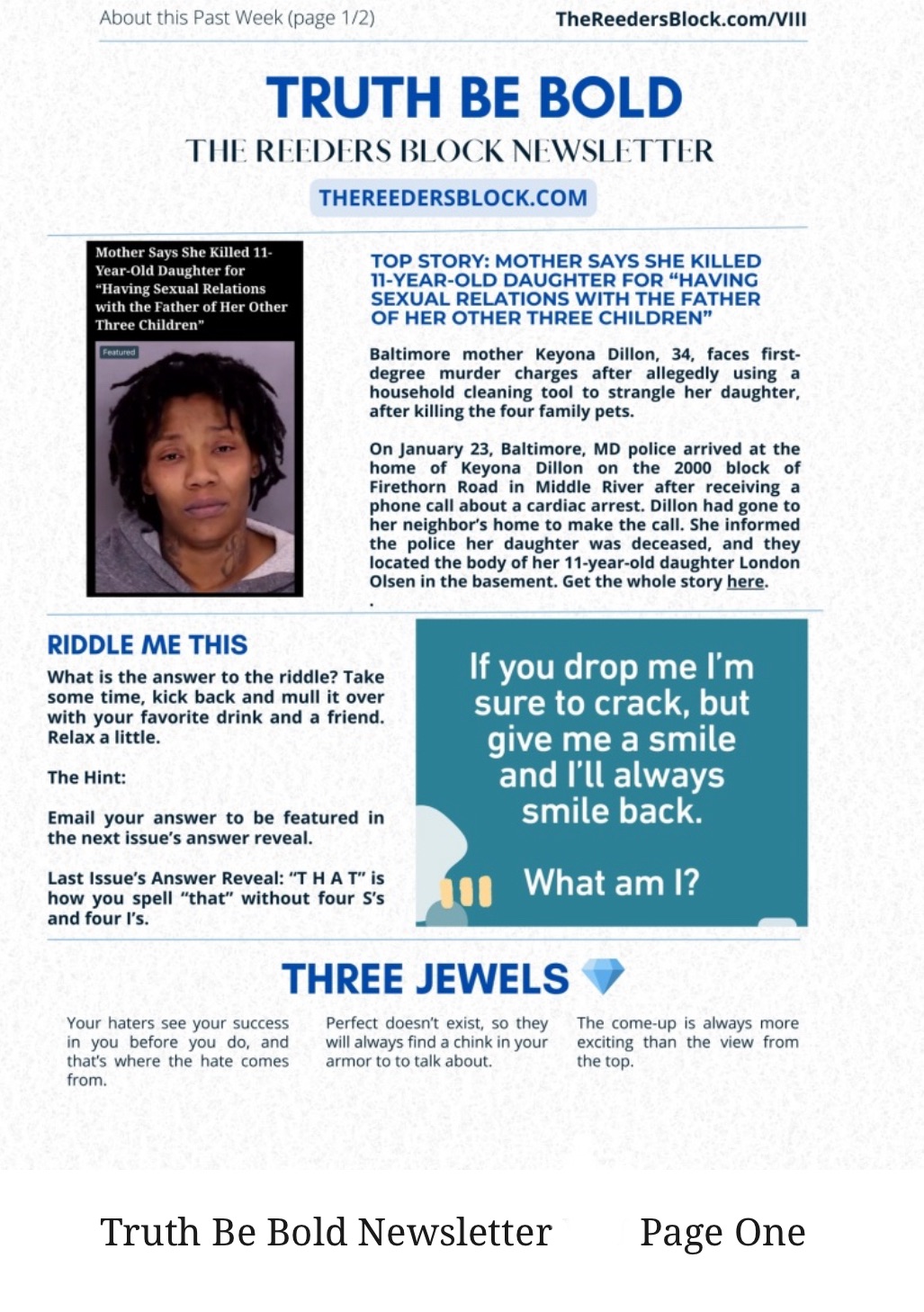 The truth is back and bolder than ever this fall with your Truth Be Bold Newsletter. Packed full of everything from true crime news to riddles and health tips, this newsletter continues to have everything you need. And the Jewels Section is more valuable than the finest diamonds. Subscribe if you haven’t to get notified when the newsletter drops this September. Get caught up on the Winter 2024 Truth Be Bold Newsletter here. Thanks for continuing to be a Loyal Reeder.