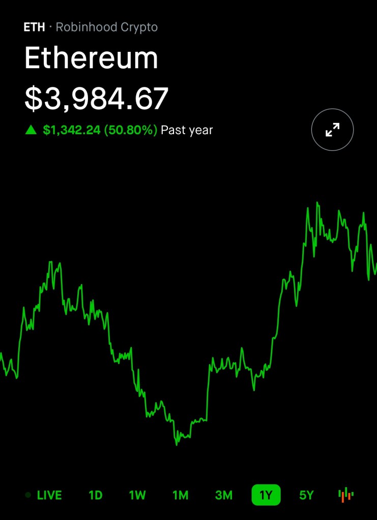 Ethereum has seen an over-50 percent growth in its price over the past 52 weeks. In mid-to-late October 2024, it was priced around $2,600. In early April of 2025, it sunk to just under $1,400 a and reached a high of $4,953.38 in August of 2025. It is currently trading at $3,984.67 at the time of this writing.