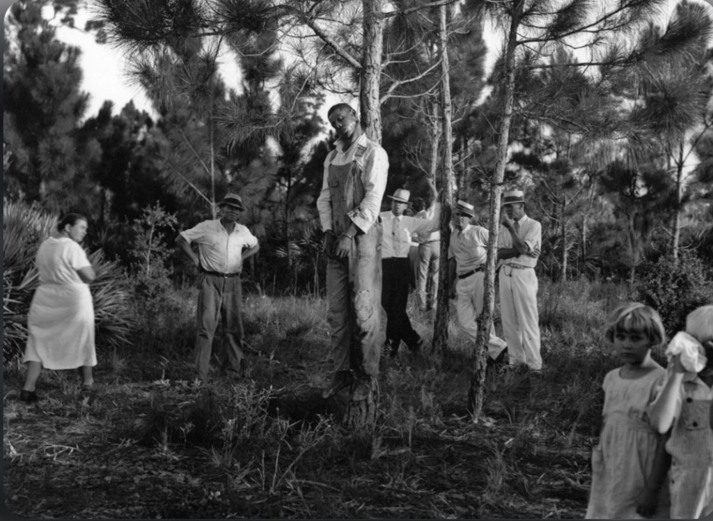 Throughout Jim Crow, hanging Black people from trees and burning their bodies became a norm. Parents would gather their children, and they would wear their best attire to head down the road to see, smell the burning body of a lynched Black man.