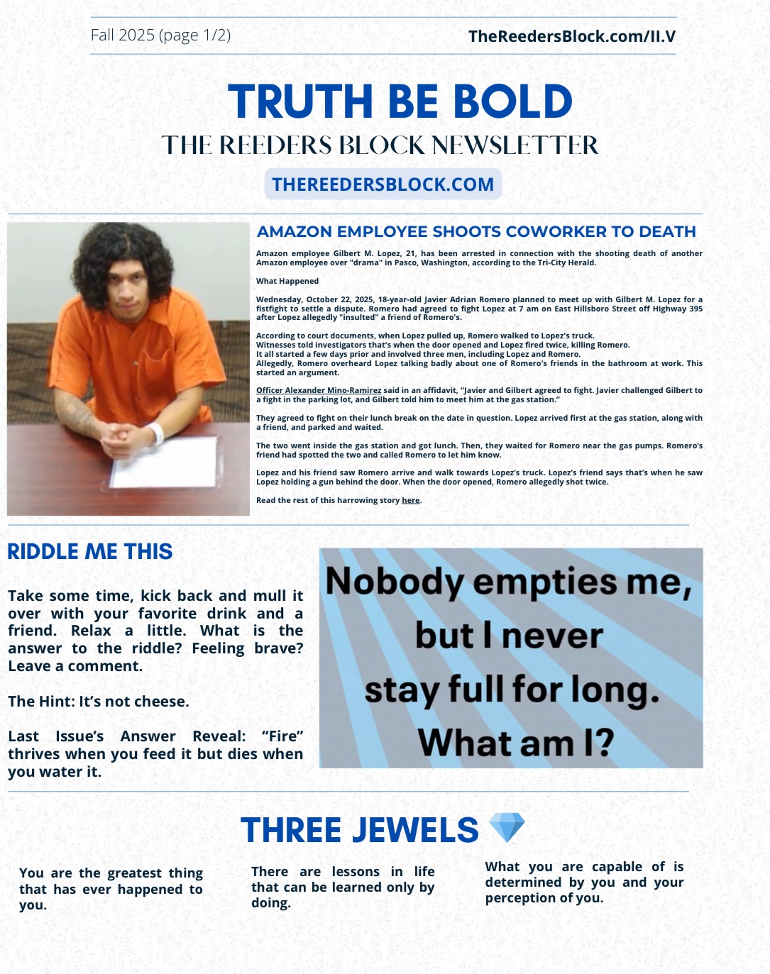 Read or DOWNLOAD your high-resolution Fall 2025 Truth Be Bold Newsletter Issue V featuring the story of an Amazon employee who shot and killed his coworker. Also, find out the safe and unsafe protein powders. Nearly all have dangerous levels of lead.