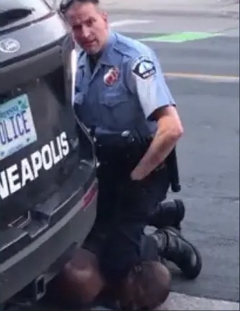 Derek Chauvin casually kneeling on the neck of George Floyd as he dies. Photo from Fox4News.com