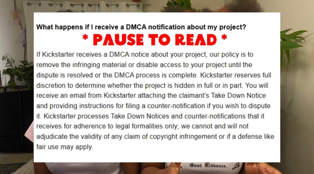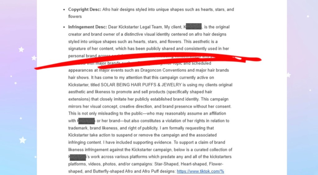 Someone had filed a DMCA copyright against her campaign. Kickstarter provided Solar with the legal complaint they had received. It had come from the attorney of creator Kwiin Ava who also works in sculpted hair.