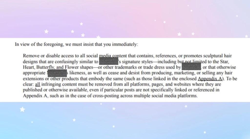Solar read the cease and desist email twice and shook her head. She couldn’t believe the long list of demands from Kwiin Ava’s attorney she was reading. It said Solar must “Immediately remove or disable access to all social media content that contains, references or promotes sculptural hair designs that are confusingly similar to [Kwiin Ava’s] signature styles — including but not limited to the Star, Heart, Butterfly and Flower.”