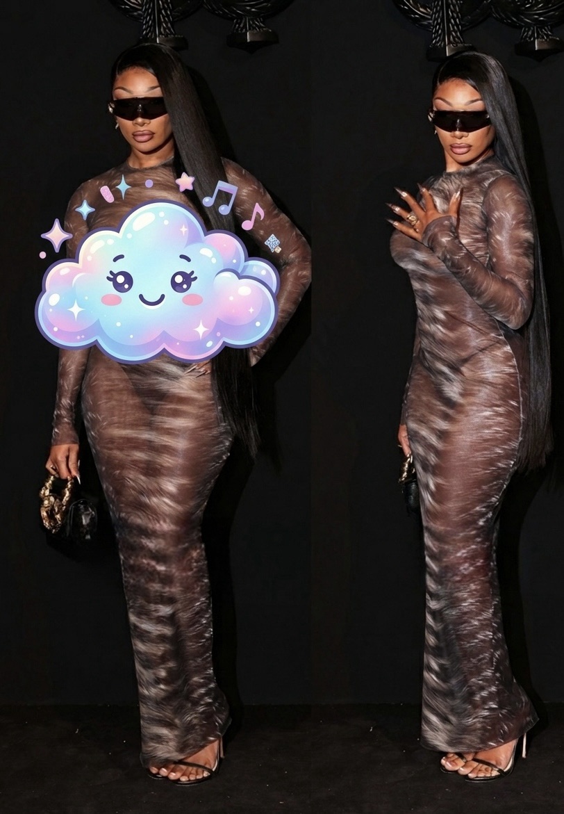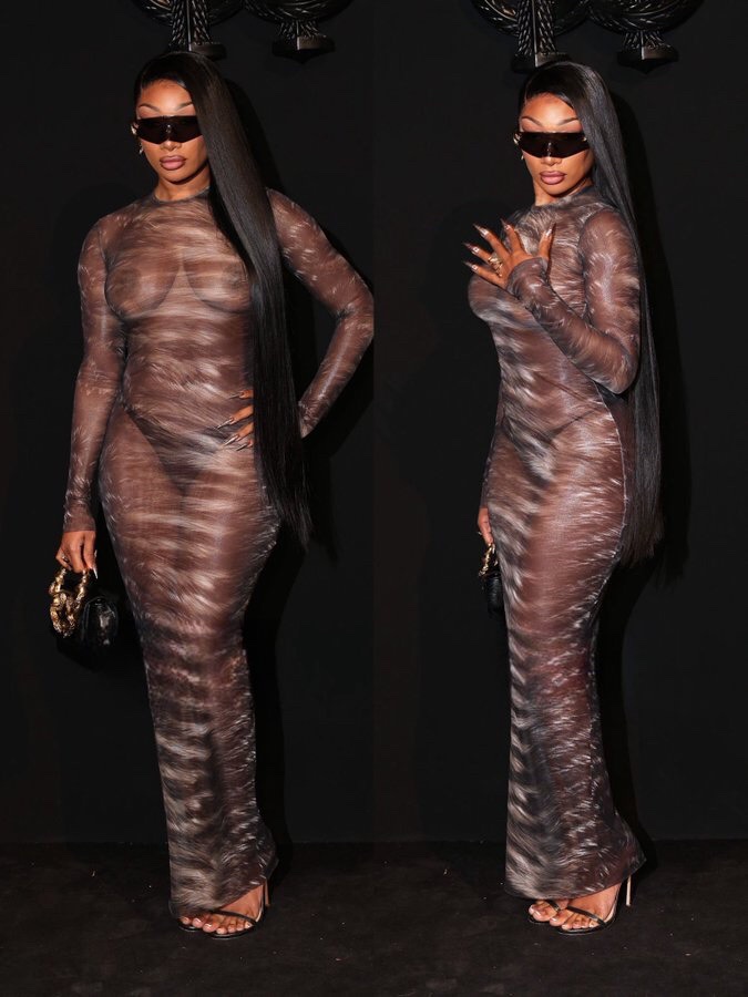 Megan Thee Stallion wore a Roberto Cavalli dress to his Roberto Cavalli Fall/Winter 2026 fashion show. If he meant for her to steal the show, he got what he wanted in diamonds. Her “figure-hugging see-through maxi dress” showed off more than her curves. It also showed off more than what was underneath.