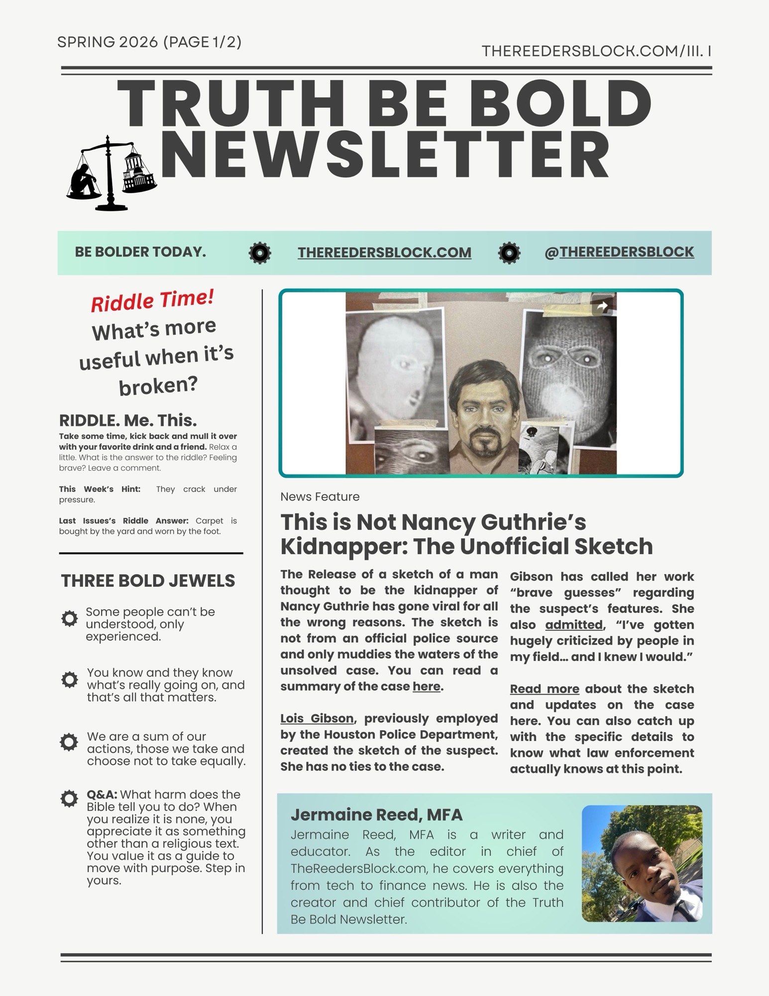 Download Your Truth Be Bold Newsletter Spring 2026 Issue I (Live now for Subscribers. Goes live tomorrow for everyone else) Posted byThe Reeders BlockFebruary 28, 2026February 28, 2026Posted inBreaking News, Entertainment, News and True Crime, Self Help Jewels, truth be bold newsletter, World NewsTags:Nancy Guthrie, what happened to Nancy Guthrie Subscribe to continue reading Subscribe to get access to the rest of this post and other subscriber-only content. Type your email… Subscribe Already a subscriber? Inform your people and share Share on X (Opens in new window) X Share on LinkedIn (Opens in new window) LinkedIn Share on Facebook (Opens in new window) Facebook Share on Reddit (Opens in new window) Reddit Share on Tumblr (Opens in new window) Tumblr Share on Pinterest (Opens in new window) Pinterest Share on WhatsApp (Opens in new window) WhatsApp Like Loading... Related Published by The Reeders Block TheReedersBlock.com brings you the latest entertainment, political and hip hop news with a dose of bold truth. Don’t forget to download your copy of this site’s Truth Be Bold newsletter. View more posts