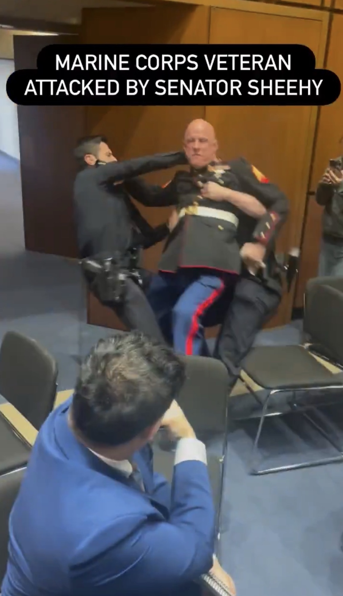 Out of the blue, Senator Tim Sheehy (R-MT), attempted to tackle McGinnis by the legs. There is an audible snap as the hand of McGinnis breaks. A man shouts, “A U.S. Senator broke the hand of a Marine.” The woman filming pans the camera around to the floor, where the Senate sits unmoving. Others refuse to turn around. The woman begs someone to help McGinnis and shames them when they do nothing.