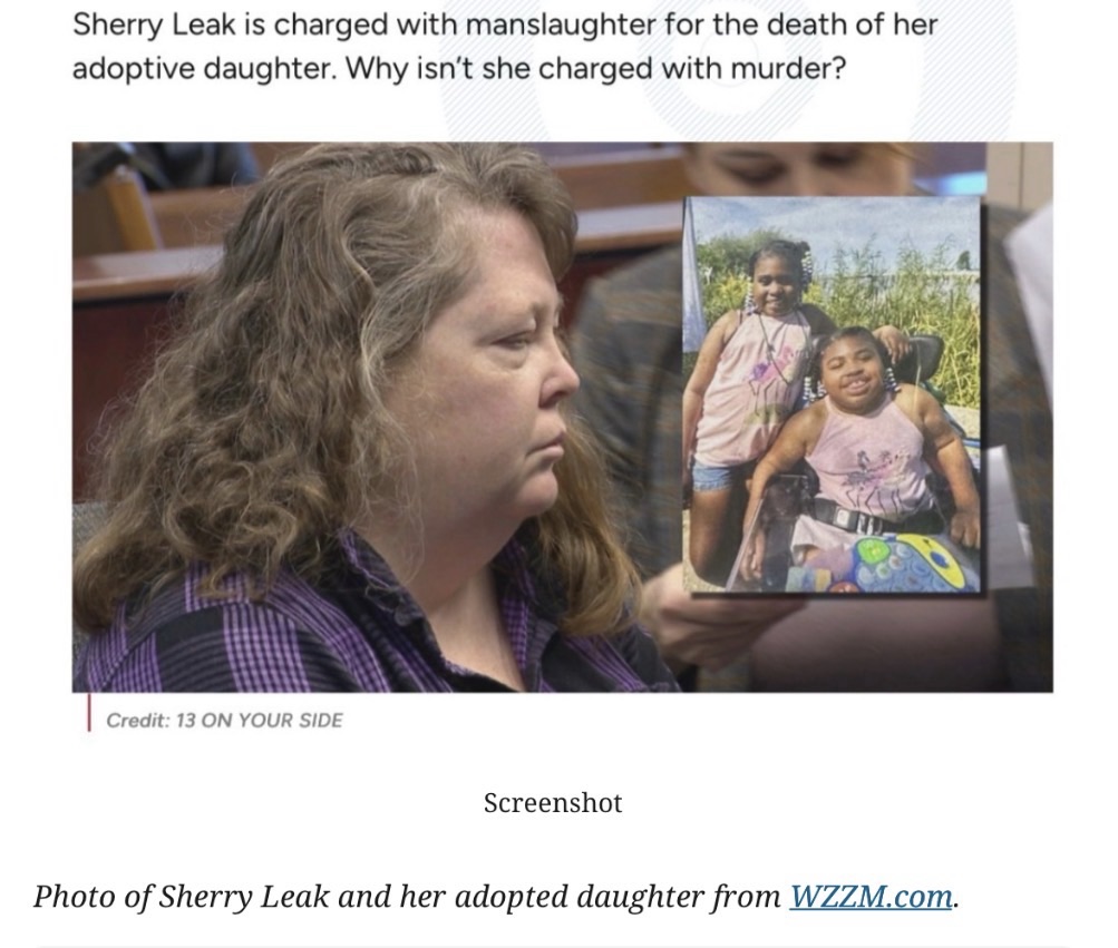 Sherry Leak of Muskegon County, Michigan is facing upgraded Open Murder charges for sitting on and killing her defenseless 11-year-old adoptive daughter. The charges are a far cry from the original charges of Involuntary Manslaughter and Second-Degree Child Abuse.
