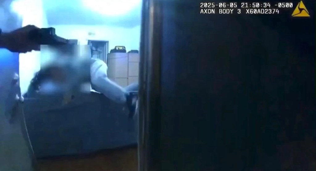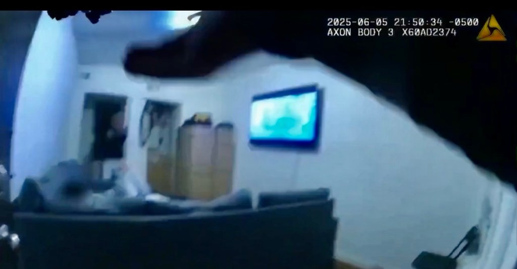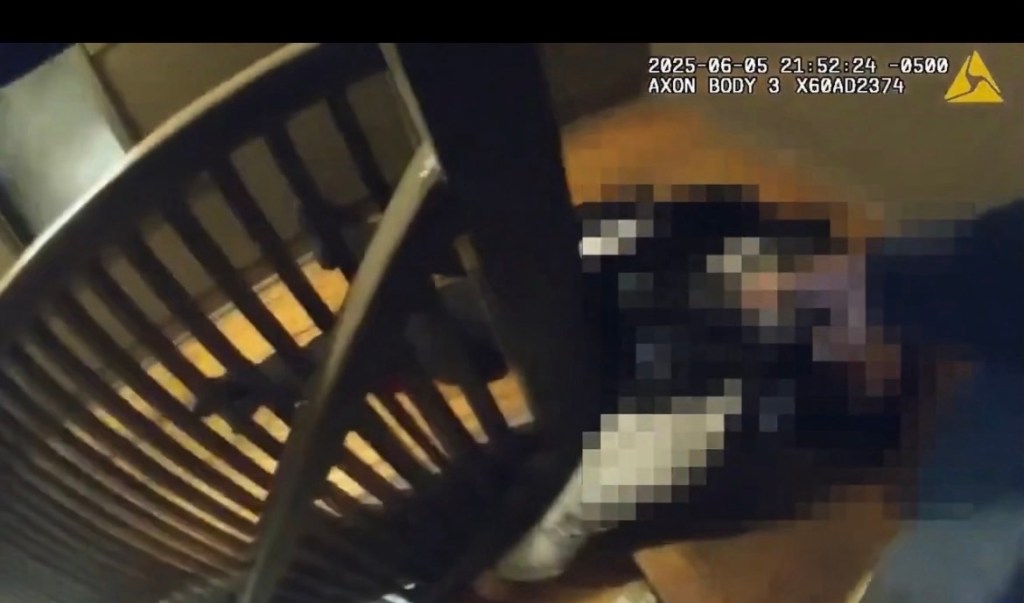 The man ran into a nearby apartment building. Baker’s bodycam footage shows Baker and Rivera make entry, chasing behind the suspect. Rivera is behind Baker, as he kicks a door in behind the suspect.