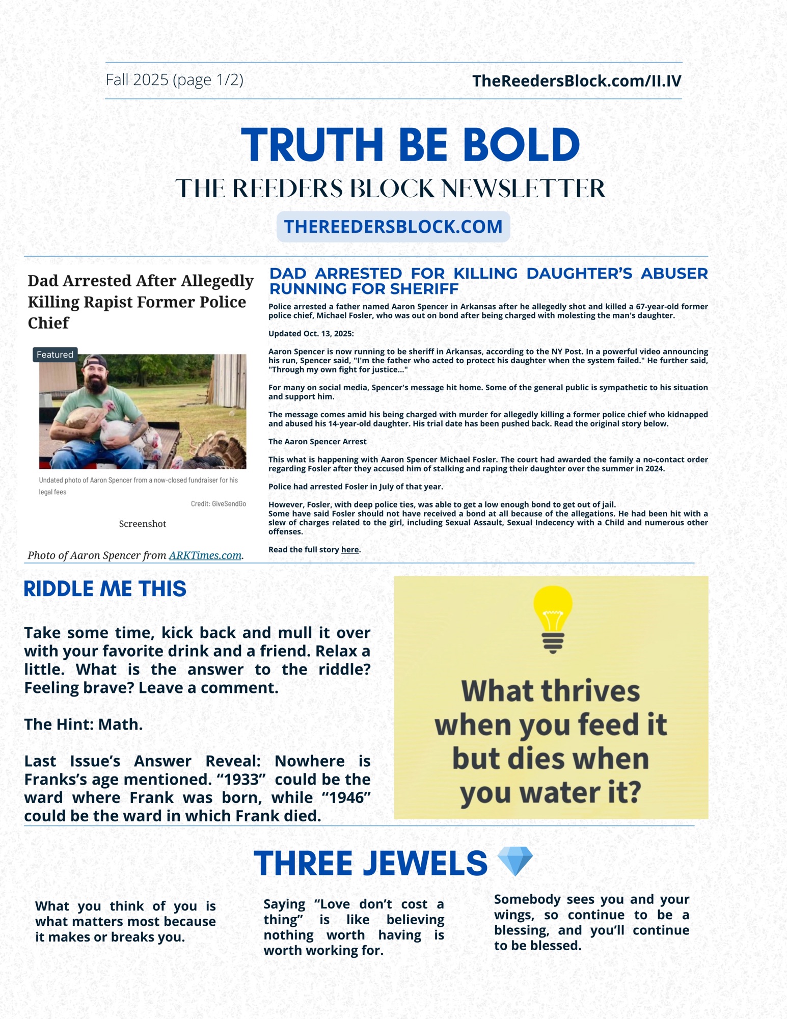 Truth Be Bold Newsletter Page 1 Read or download your Truth Be Bold Newsletter featuring the breaking story involving a mother whose children froze to death. Subscribe for email updates on the newsletter and more. To access any links in the newsletter, download it. Email your answers to this week’s riddle to TheReedersBlock@ReedersBlock.com for aContinueContinue reading “FYP: Read or Download Your Truth Be Bold Newsletter to”